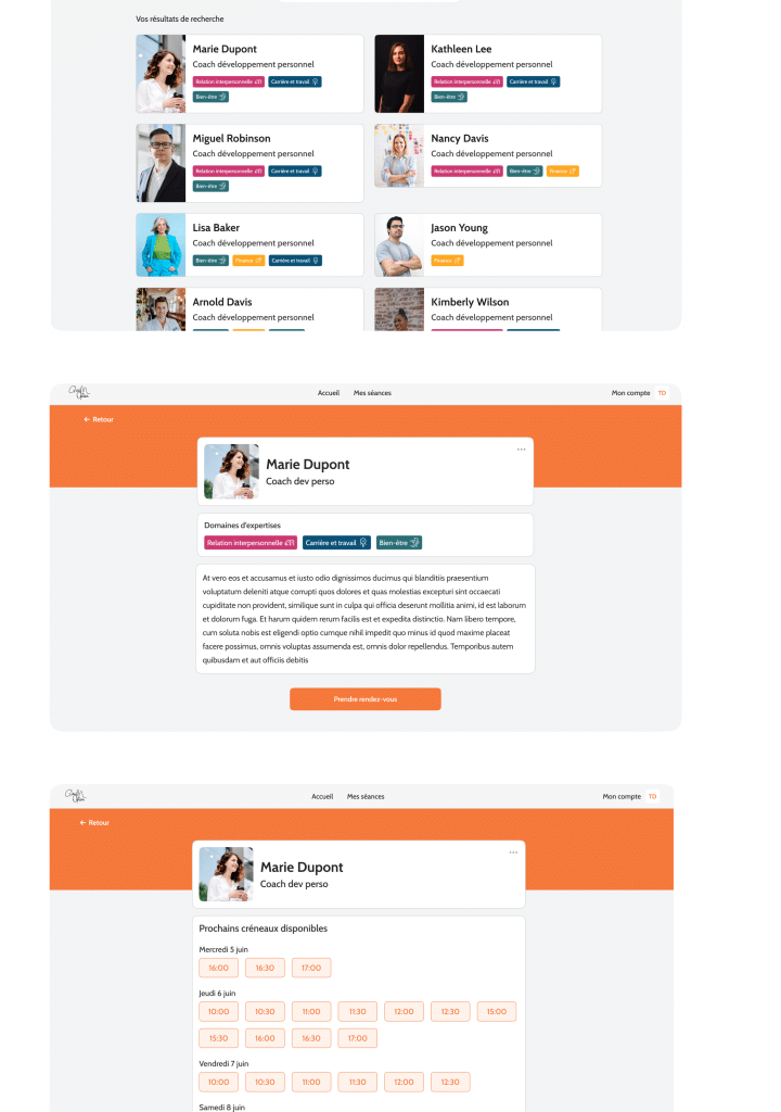 L’équipe UX/UI de Mayasquad a travaillé à la création d’une interface simple et puissante, capable de gérer efficacement la prise de rendez-vous ainsi que la communication entre les deux types d’utilisateurs. Nous avons optimisé les parcours utilisateurs pour permettre une navigation claire et une expérience de prise de rendez-vous fluide, depuis le choix du professionnel jusqu’à la finalisation du rendez-vous.